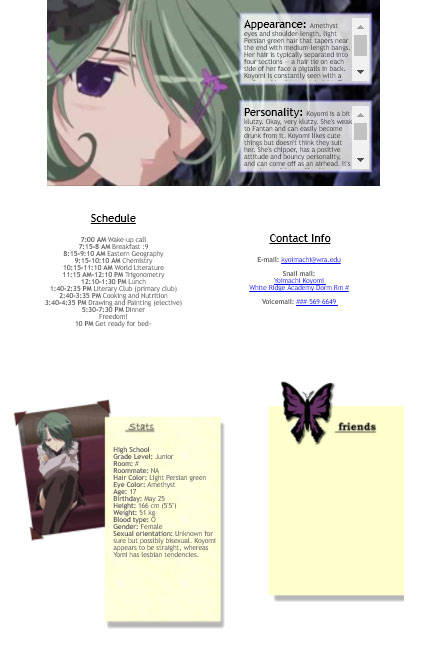 Design coded for a Livejournal profile. The character Koyomi from Peach-Pit and Xebec M2's Zombie-Loan is assumed to be a character at a fictional school in this scenario. Original concept and images of the character belong to those studios. Additional visual elements are my work. The webpage was created in Notepad and then Livejournal's profile interface, where its compatibility was checked.
